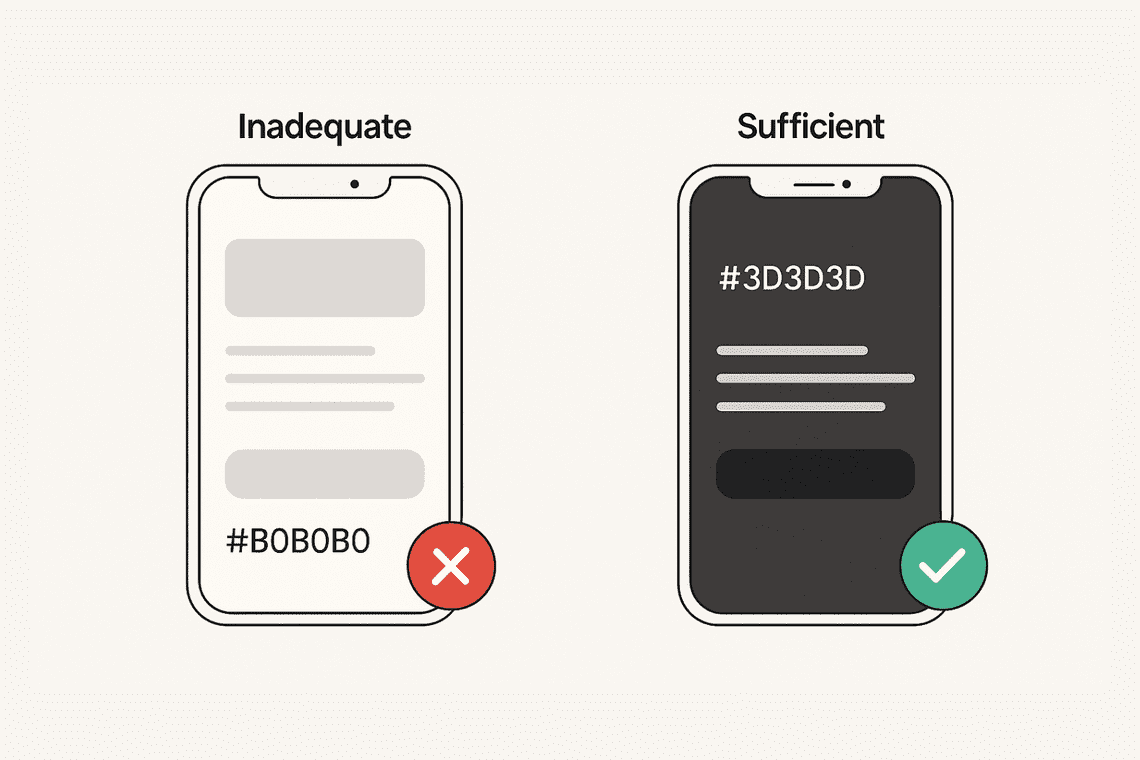 Imagine a mobile UI with light gray text (#B0B0B0) on a white background. In perfect lighting conditions, it may look minimal and modern. But for users with reduced contrast sensitivity, it becomes a guessing game. Changing the text to a darker tone like #3D3D3D increases legibility while keeping the aesthetic clean.