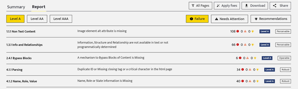 Our audit insights highlight instances of inaccessibility, how to prioritize, and the breakdown across WCAG standards - A, AA, and AAA.